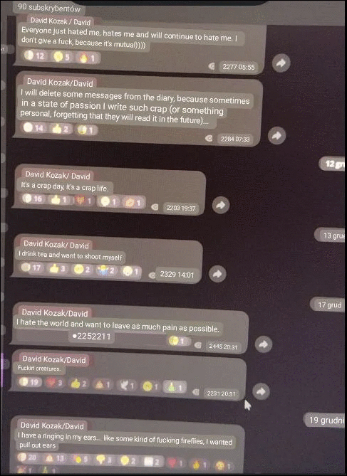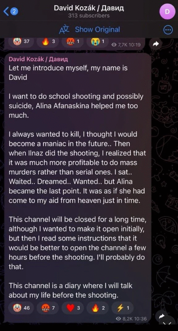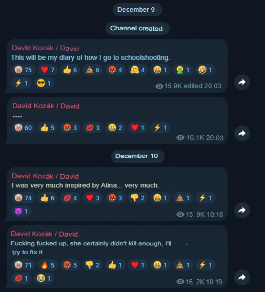 Střelec však vraždil už dříve. Kromě toho, že doma před střelbou ve škole zabil svého otce, podle názoru policie vraždil i o týden dříve v Klánovickém lese, kde měl zabít muže s jeho dvouměsíční dcerou, se kterými neměl žádné osobní vazby. Již předtím si na začátku prosince podle nepotvrzených informací založil „deník“ na sociální síti Telegram, kde se otevřeně přiznal k jeho plánu. Z jeho údajných postů je zajímavá zejména jeho otevřená nenávist ke společnosti vyjádřená v pocitu, že on sám je všemi nenáviděn, kdy zároveň adoroval střelbu čtrnáctileté školačky Aliny Afanaskinové ve škole v Brjansku, která se odehrála 7. prosince – dva týdny před jeho vlastní střelbou. Za pravost těchto screenů však nemůžeme ručit.